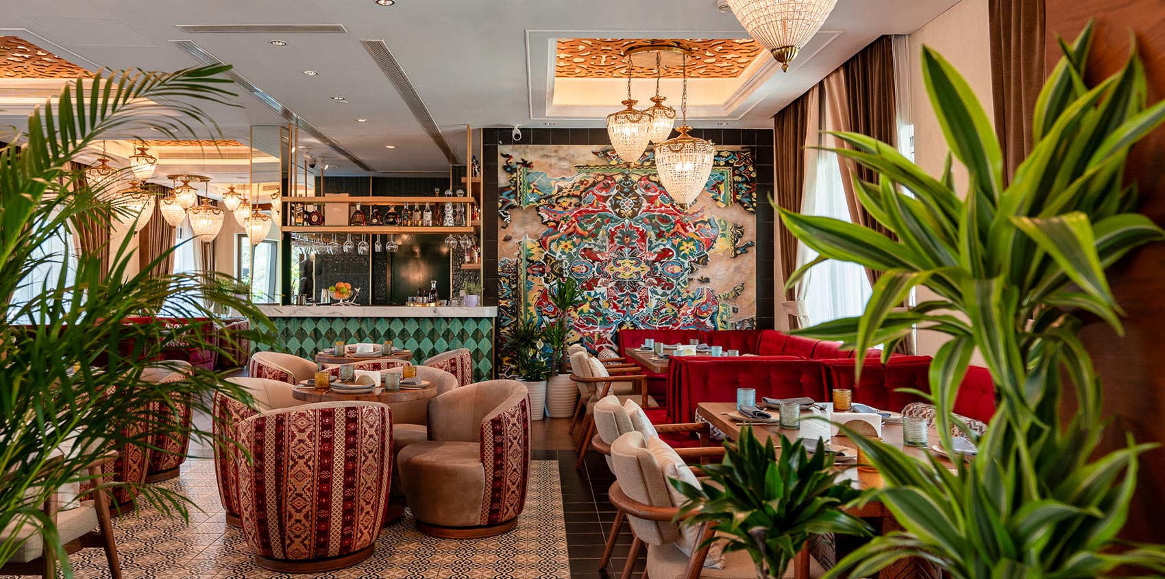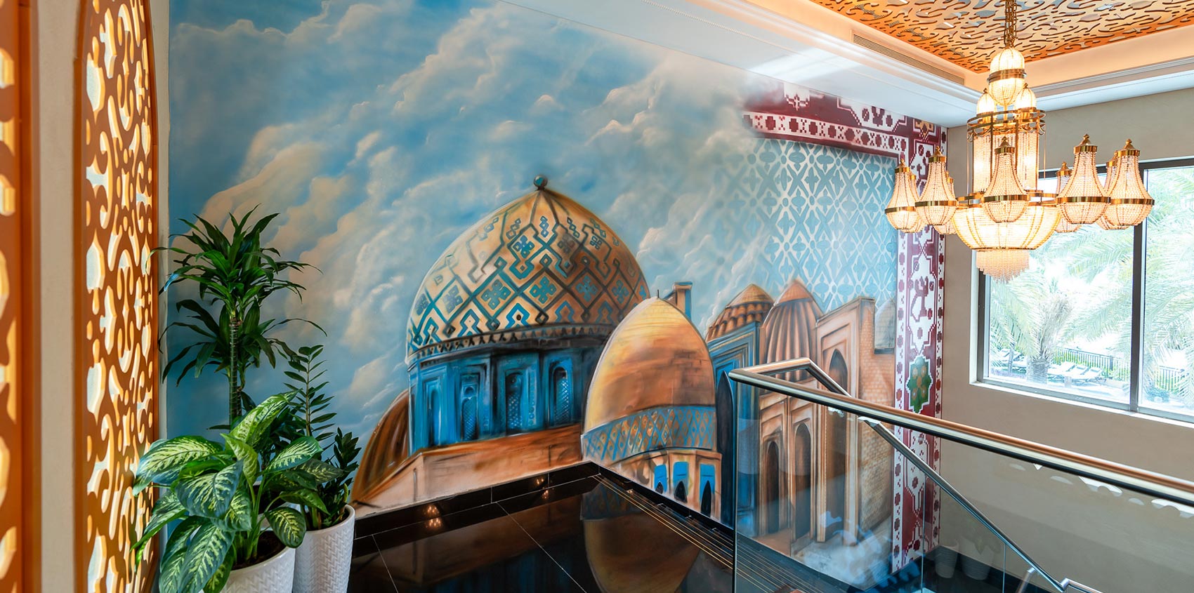 Grand ZOR at Fairmont The Palm is a stand-alone, fully licensed restaurant created as a complete dining and lifestyle destination. With its own private entrance from West Beach, along with both valet and self-parking options, the venue offers easy and direct access while remaining seamlessly connected to the Fairmont setting. Located on the ground floor, the restaurant opens onto a spacious terrace overlooking the marina, surrounding greenery, and Dubai’s skyline, making it ideal for daytime dining and relaxed evenings. Inside, the atmosphere is warm and immersive, shaped by hand-painted walls, intricate mosaic details, flowing fountains, and richly layered interiors inspired by Uzbek culture. Guests arriving from the self-parking side are welcomed by a striking 3D-effect painted photo wall, creating a memorable visual moment. The venue is also family-friendly and hosts regular kids’ cooking masterclasses, while adults can enjoy the upstairs lounge with its distinctive design and one of the top shisha experiences in the UAE. A small outdoor stage adds character to the space with occasional live performances. The menu blends Uzbek cuisine with Mediterranean and Eastern European influences, offering a large and generous selection designed for sharing, including Uzbek osh, lagman, delicious flavors of samsa, chuchvara, manti, and a wide variety of shashliks, all served in a setting where time tends to slow down naturally.